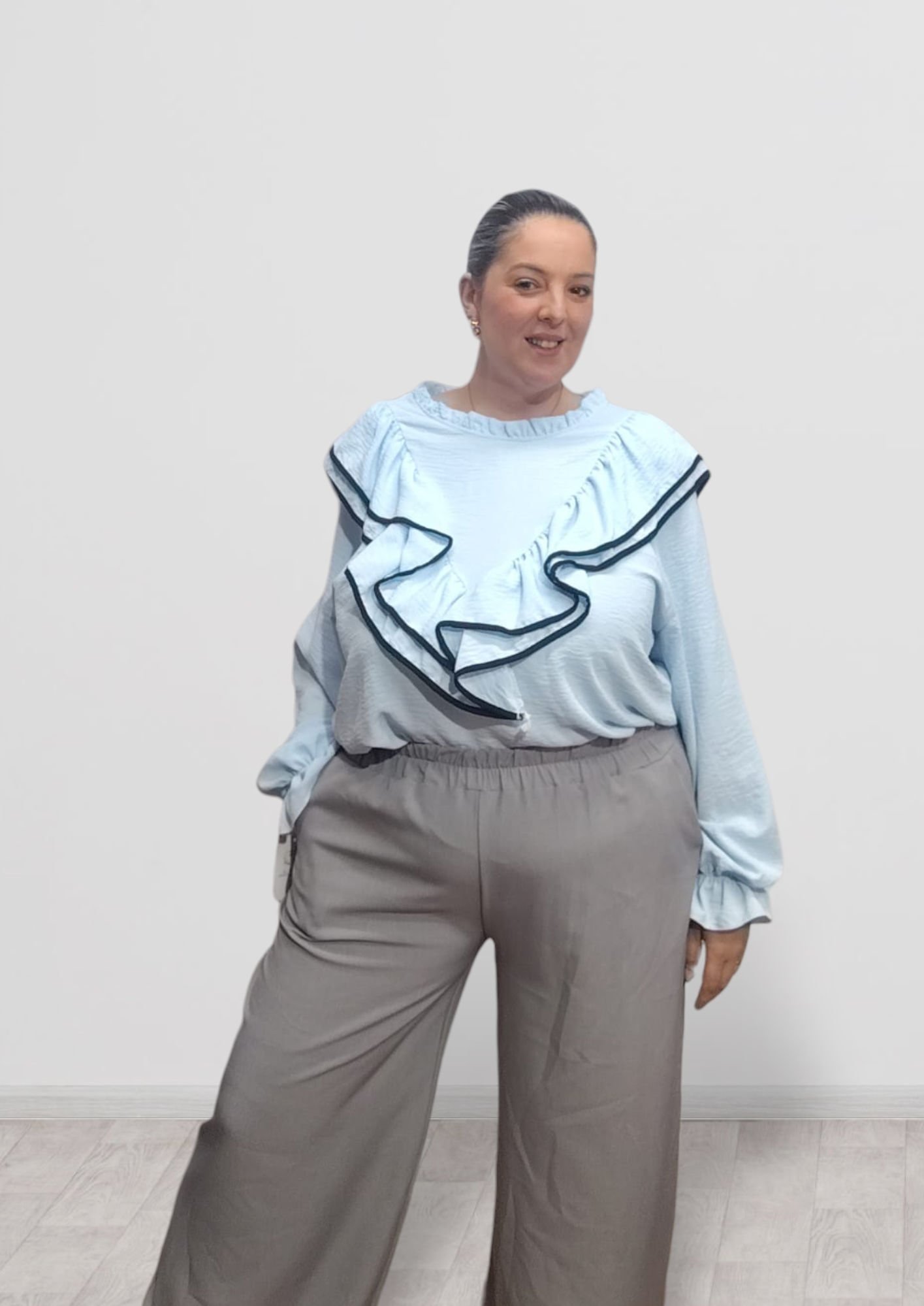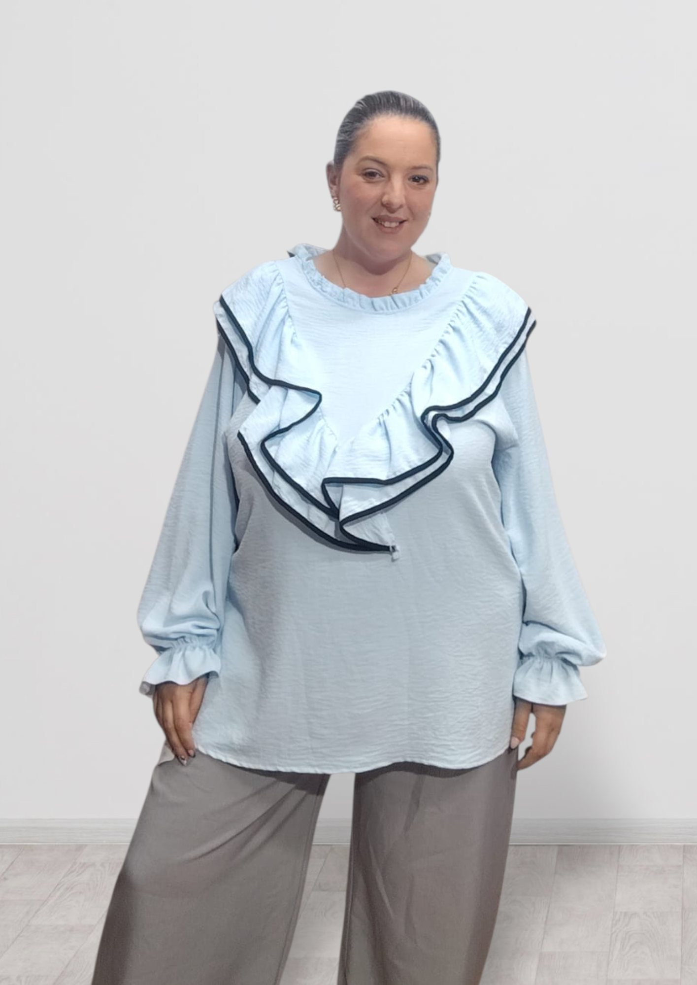 blusa preciosa con fruncido en las mangas y volante en el escote y espalda