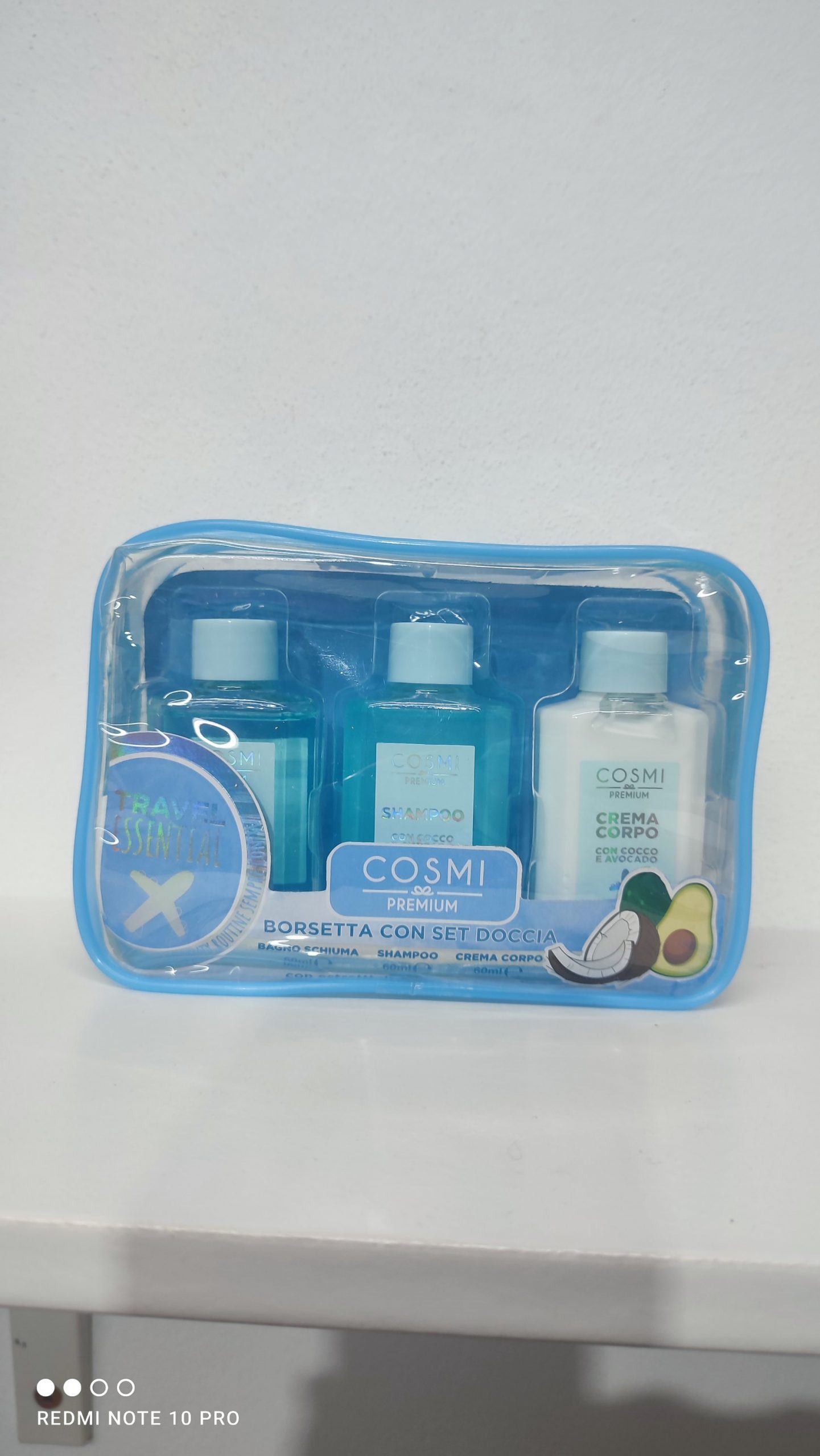 compuesto por neceser, gel, champú y crema corporal