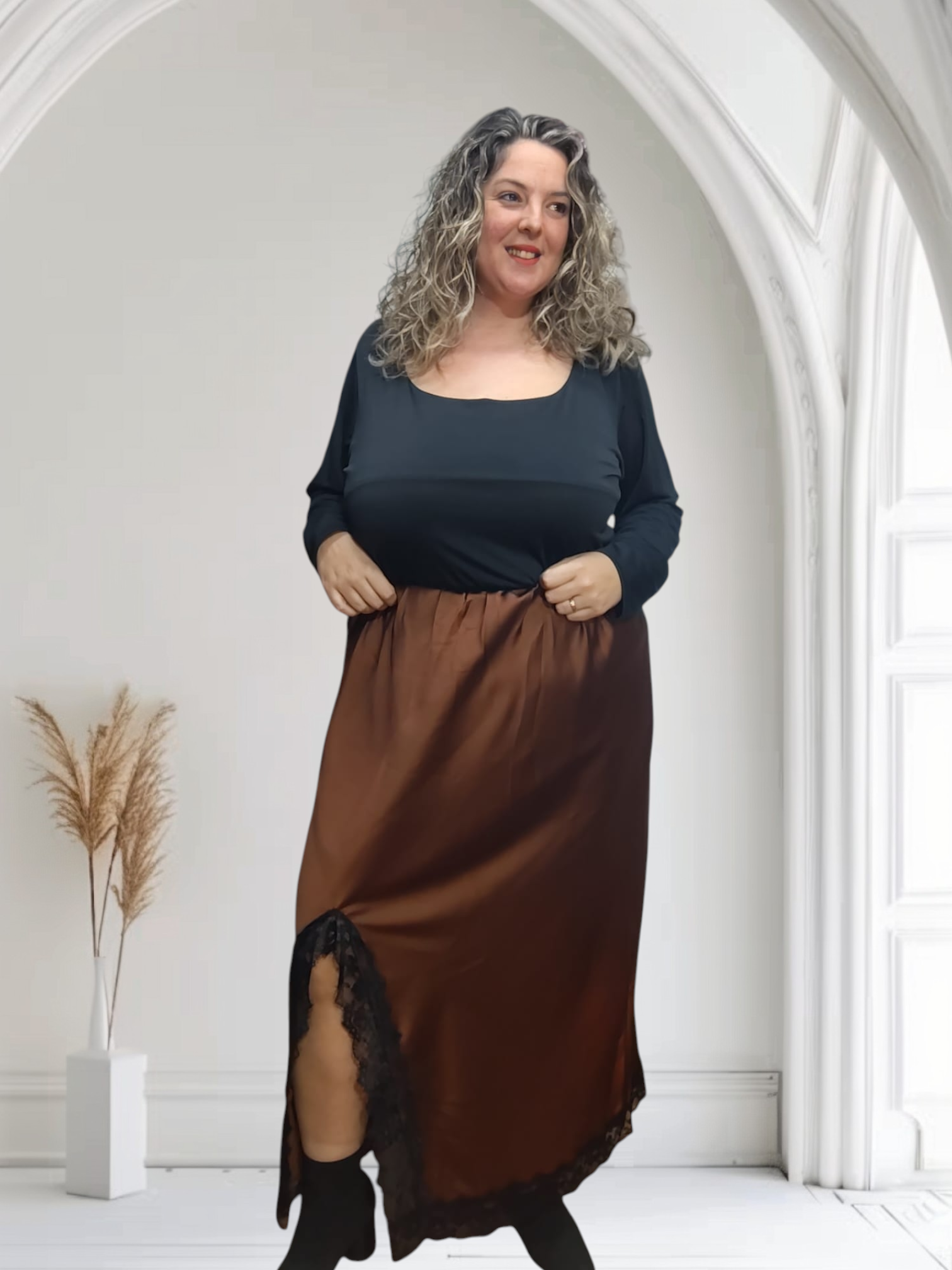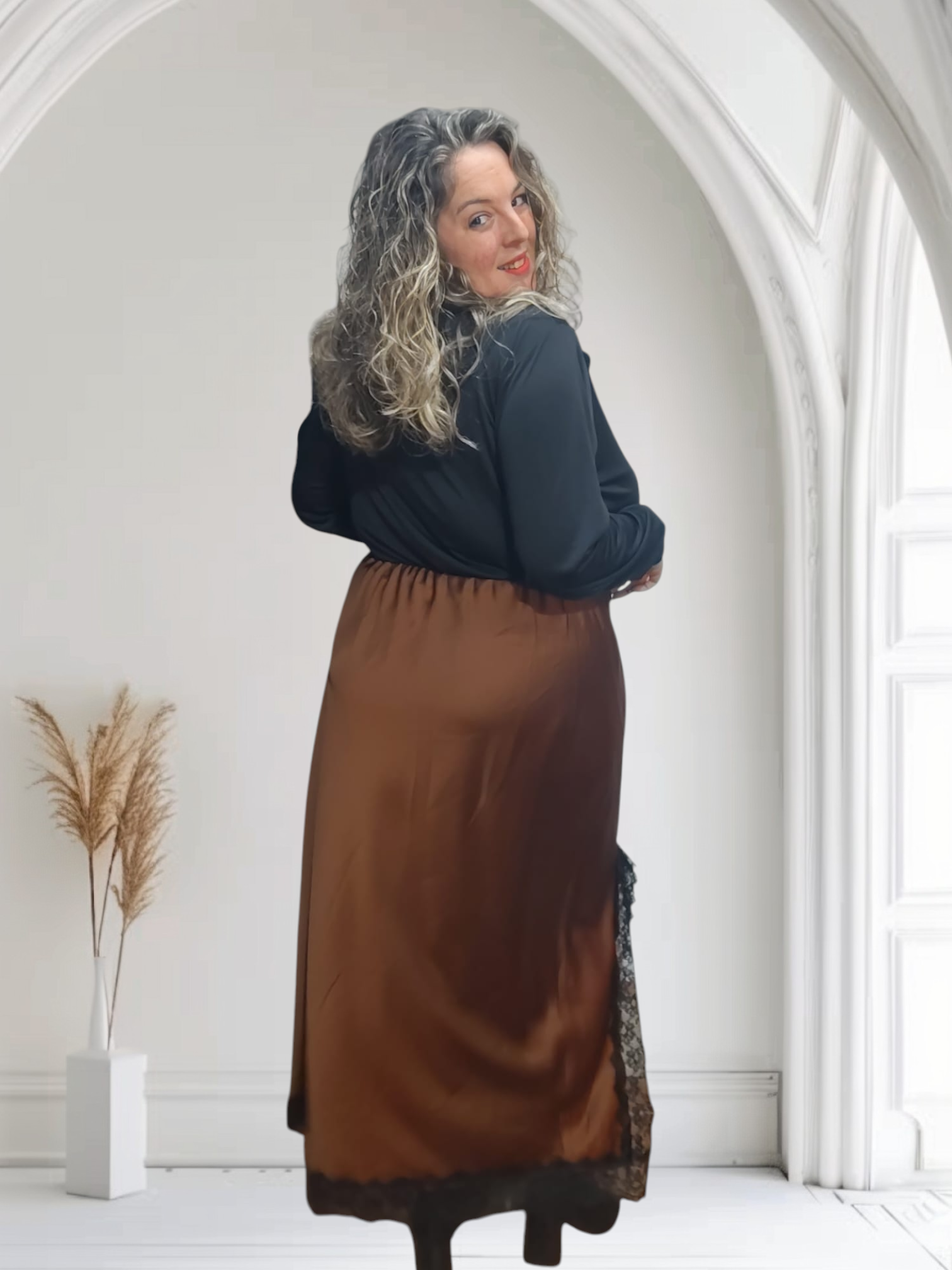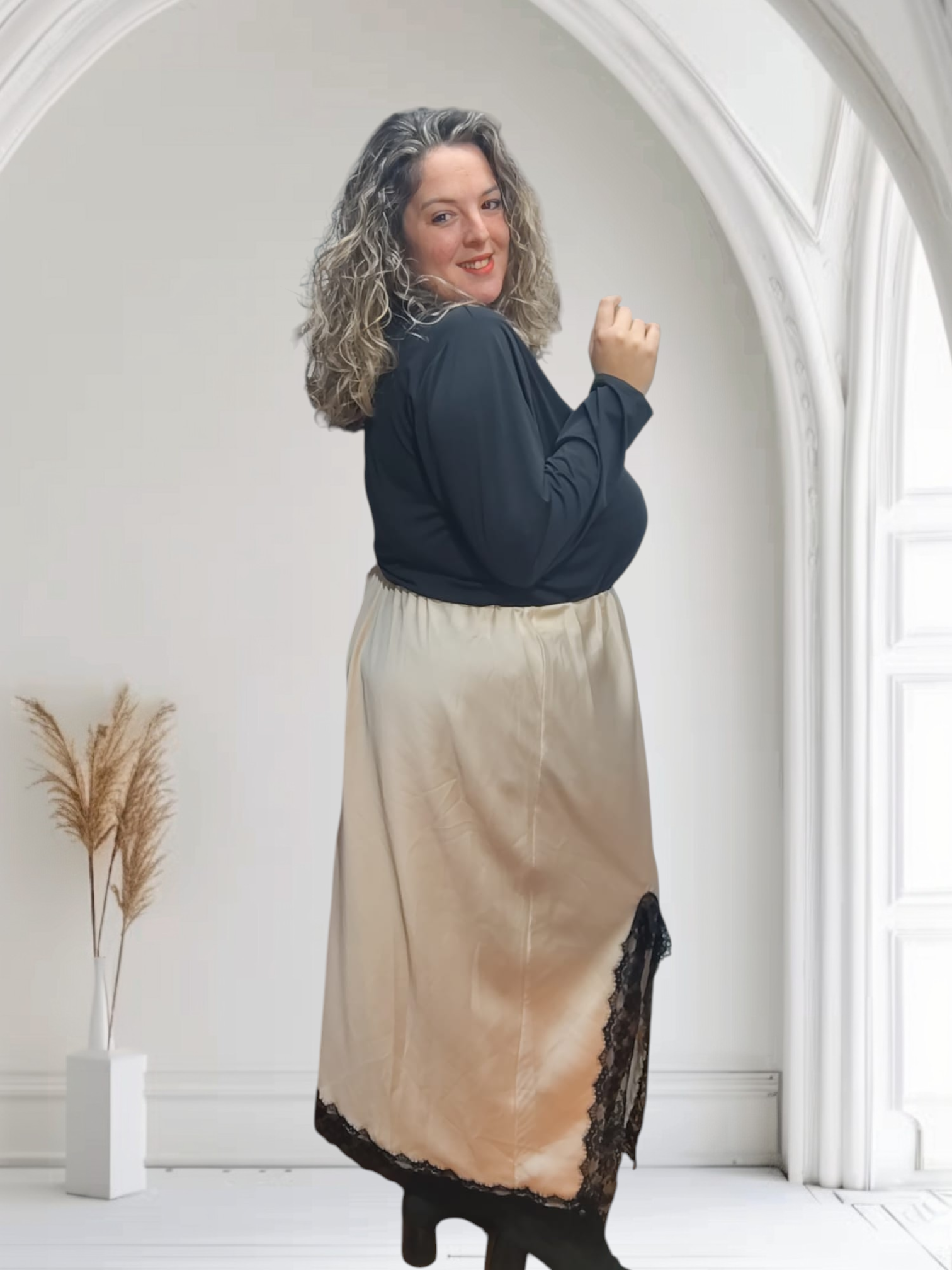 falda satén con apertura lateral y bajo de encaje