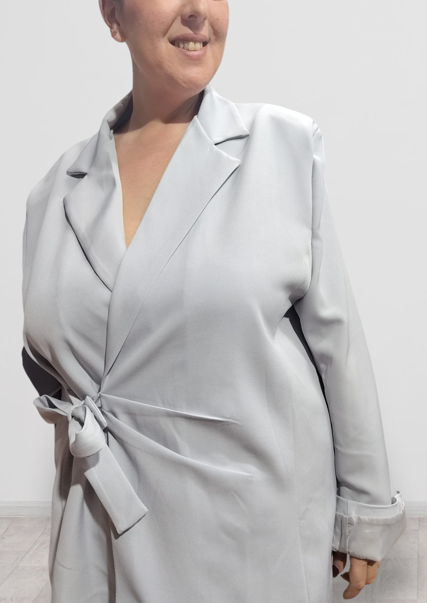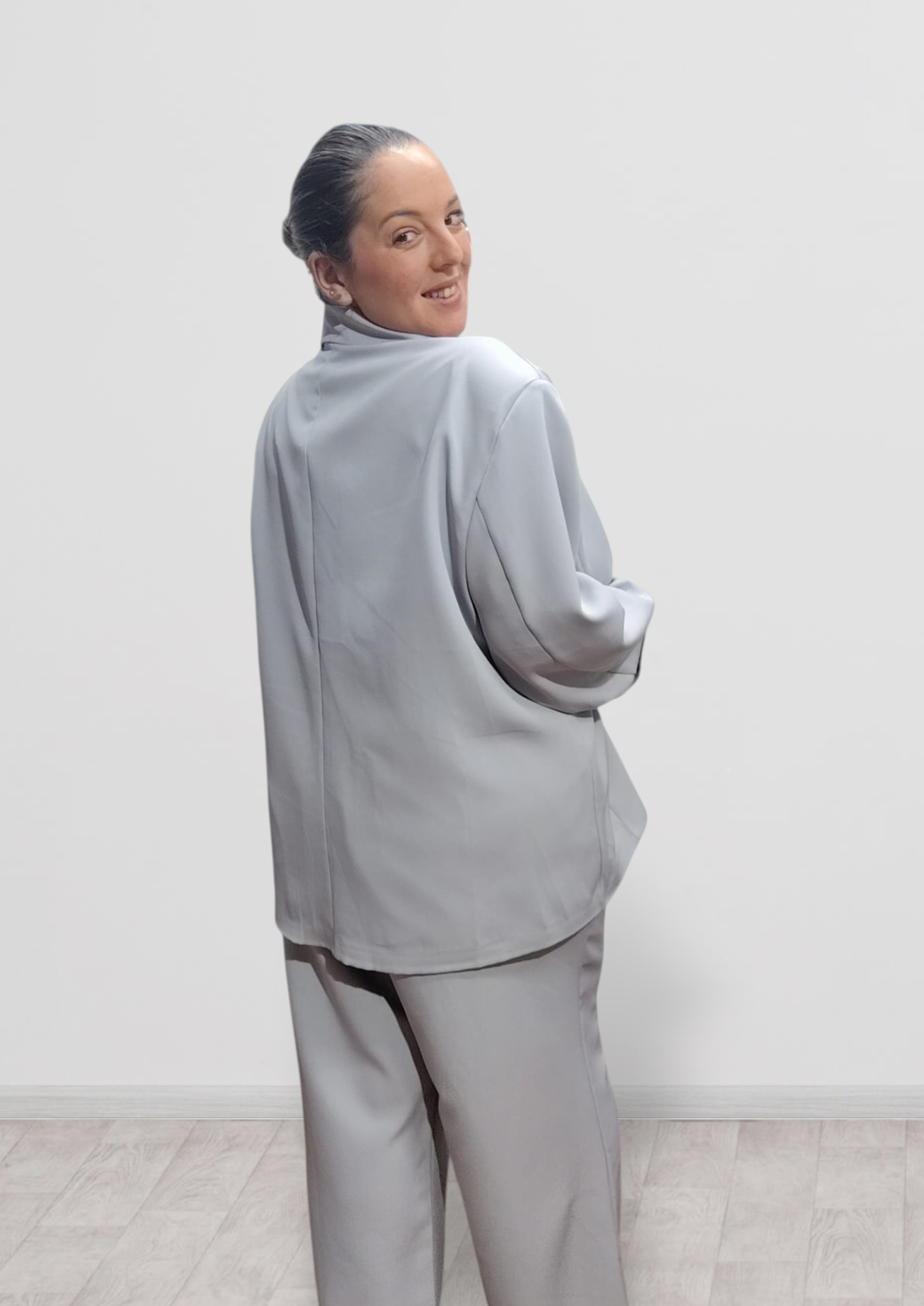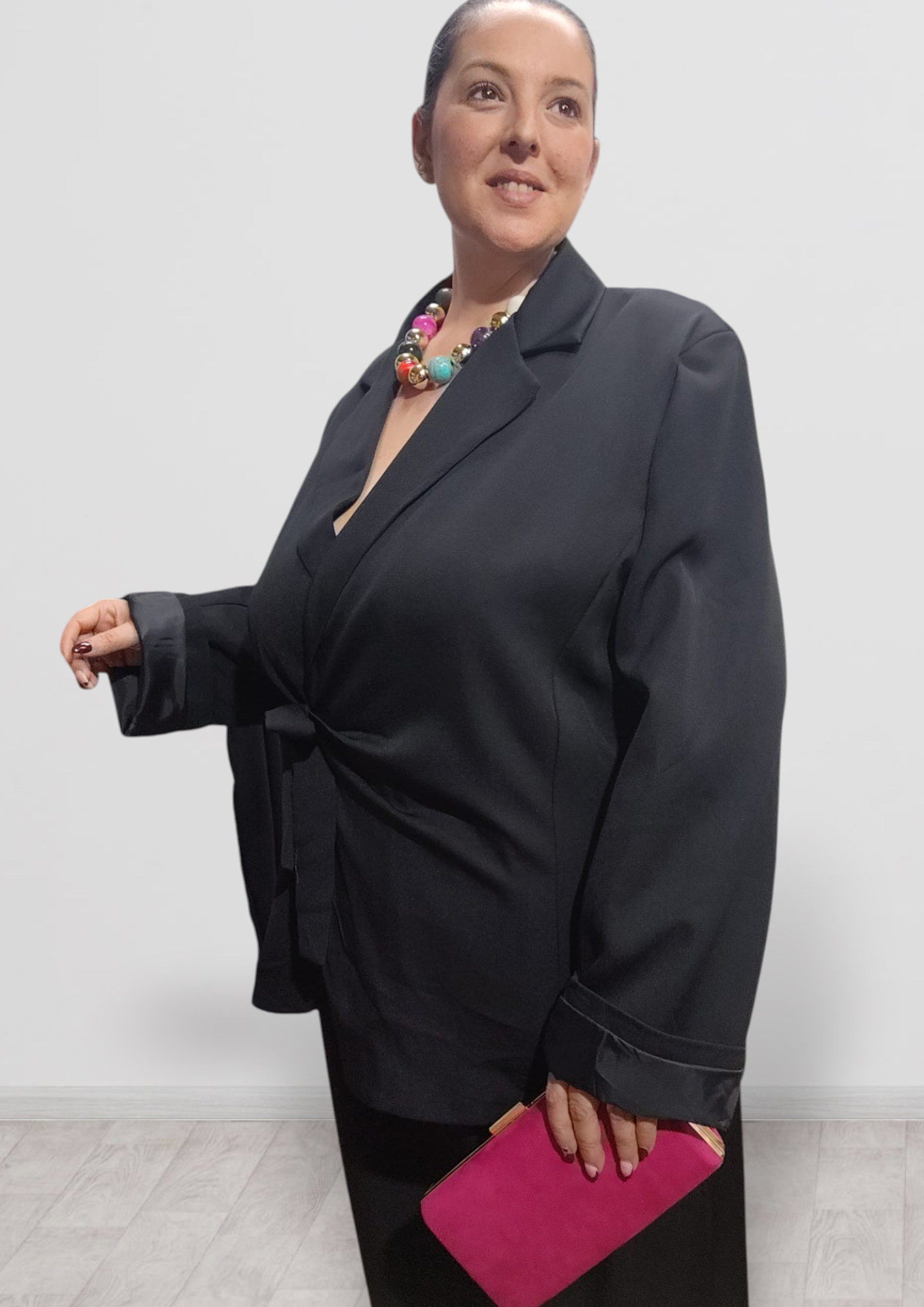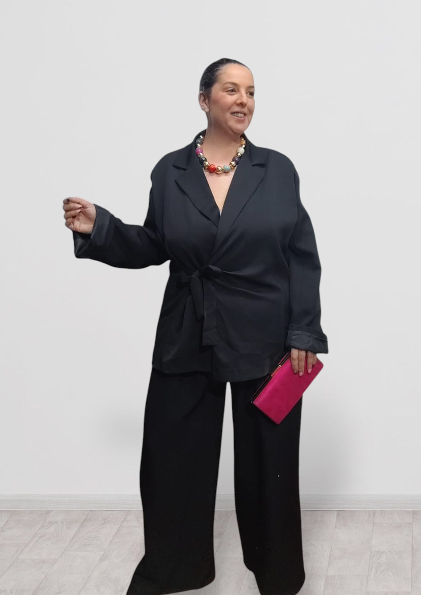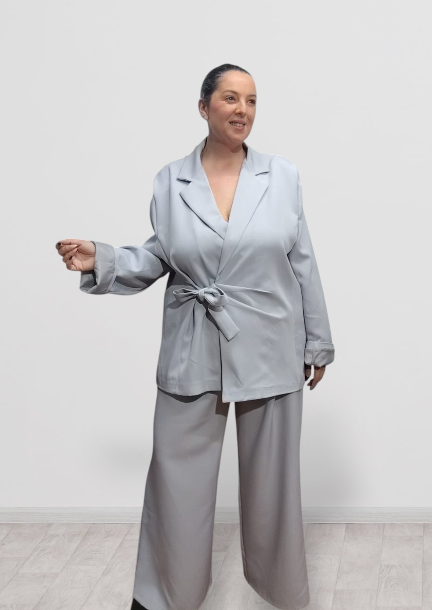 conjunto de blazzer con detalles de lazo y pantalón Palazzo tipo traje con cintura elástica